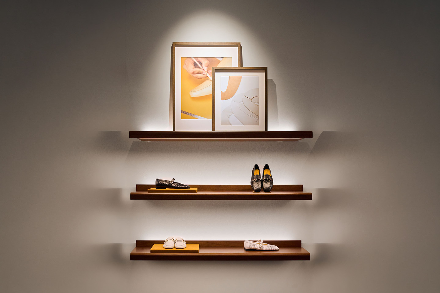 - Accenti Cromatici: L'illuminazione enfatizza i riflessi dorati, lucidi e opachi dei gialli e del "golden cream" Doucal's, trasformando il colore identitario in un punto focale discreto ma prezioso.