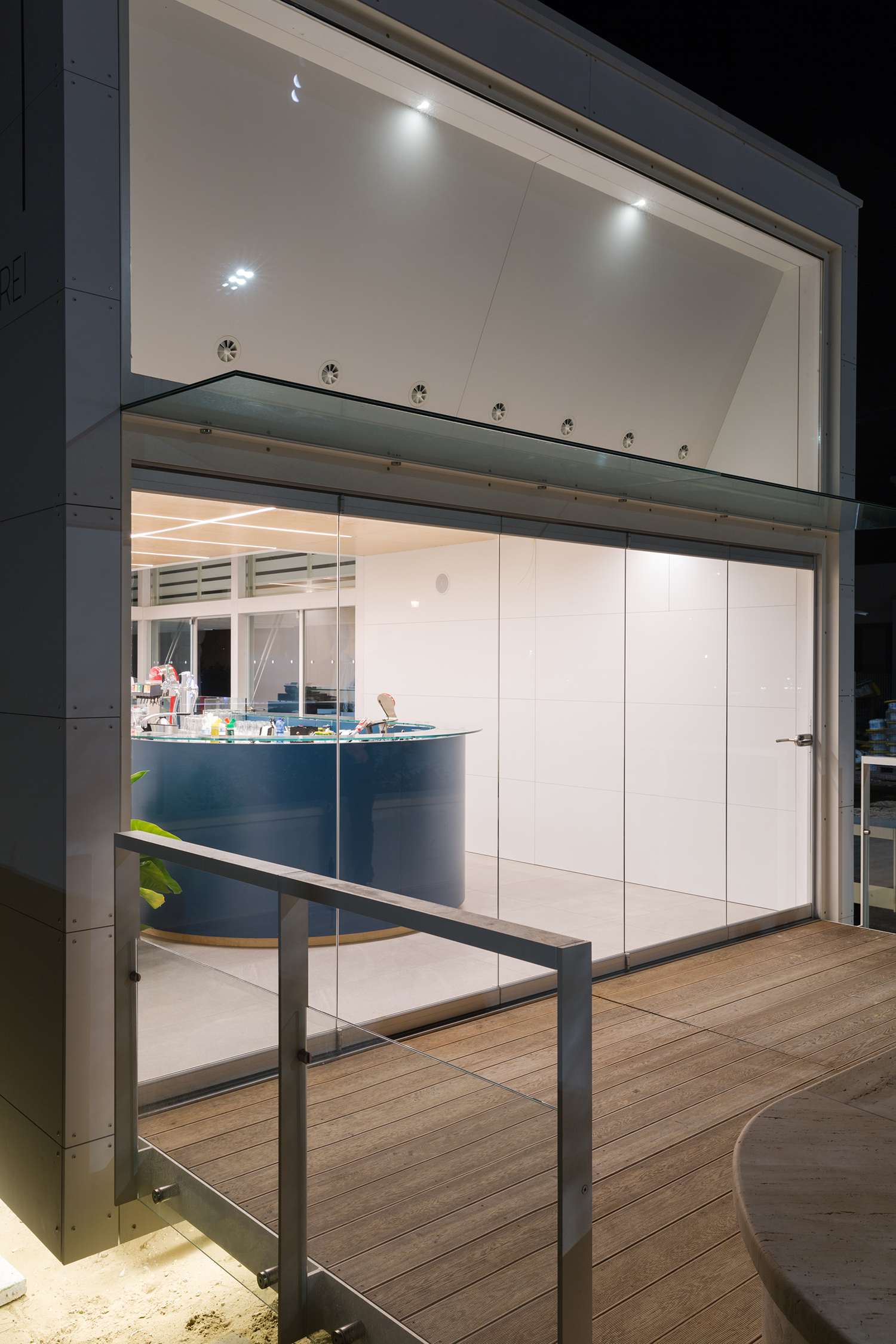 galleggiamento (NDR evidenziato da STRIPLED perimetrali che corre alla base della struttura) che le conferisce l’aspetto di una nave in attracco, collegata al molo (marciapiede della riviera) tramite due passerelle; la prima connette sul lato ovest il bar con la riviera, mentre la seconda costituisce l’accesso vero e proprio alla concessione e si trasforma in una piattaforma che, mantenendosi in quota, fiancheggia tutto il fronte sud fino alla rampa di collegamento alla sabbia.