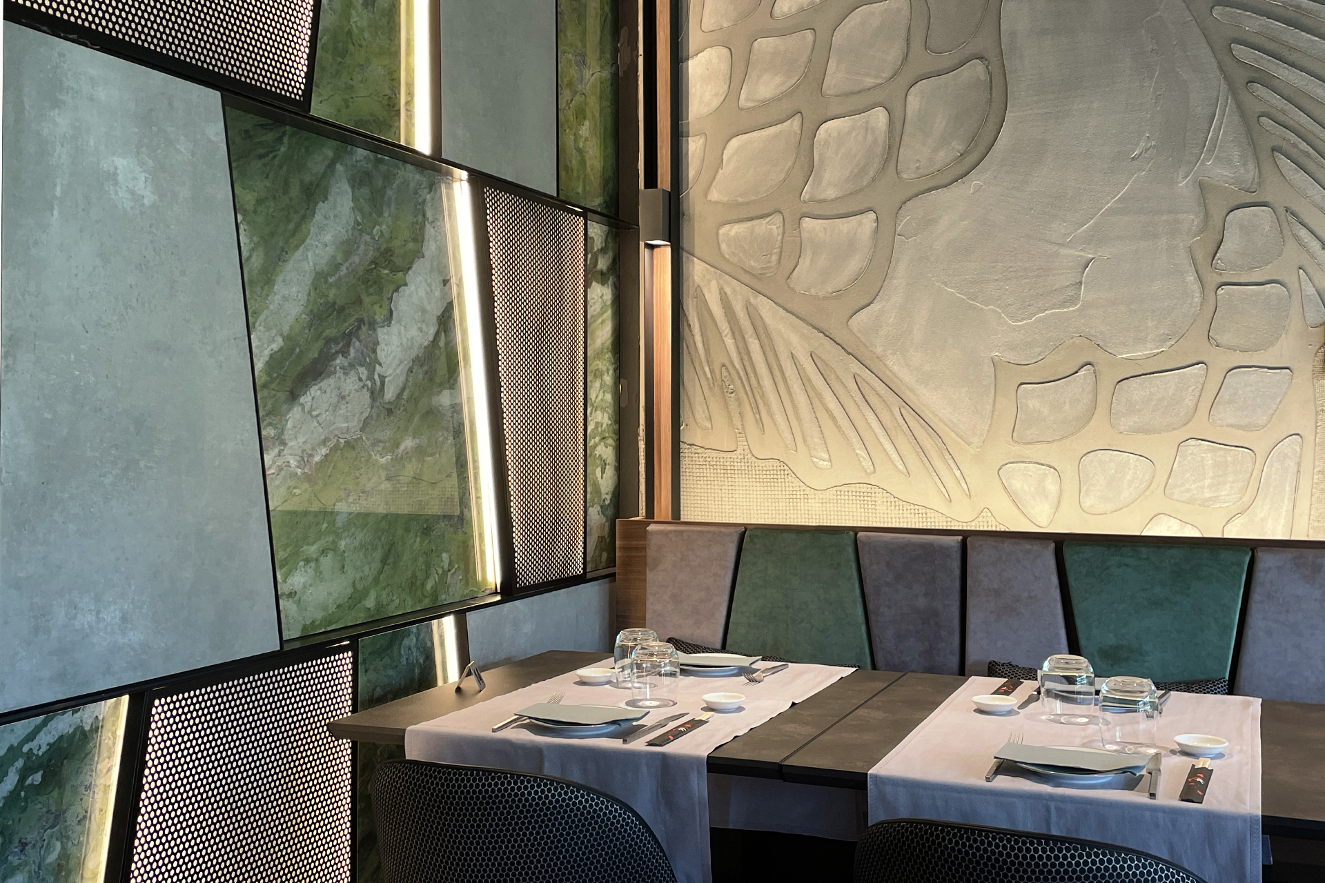 I disegni del ristorante "Yun Taste of Japan" sono di LEND Studio Architettura Ingegneria. Tra le innovative scelte progettuali spicca la valorizzazione dei rilievi sulle pareti accentuate dall'incastonatura di strip-led nascoste che diffondono una luce radente creando un effetto scenografico di grande impatto anche nelle ore diurne. La luce viene progettata sapientemente dagli architetti Nicola Bottoni e Elisabetta Puviani (LEND Studio) diventando un elemento di fondamentale rilevanza sia negli spazi comuni che nell'intimità dei commensali.
